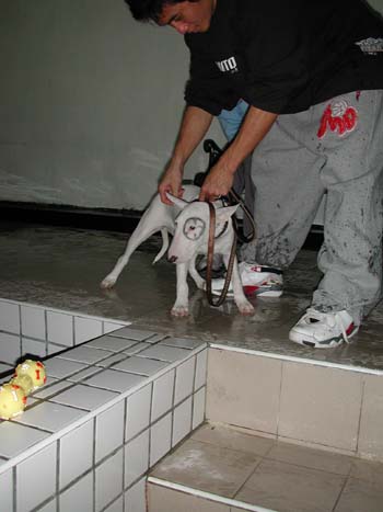 讓媒體拍攝及採訪後,球星們看到泳池,就讓狗狗下去游泳囉!