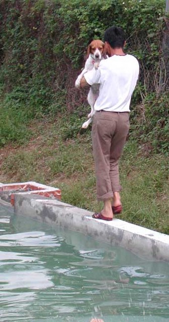 在農莊時,經常找機會就帶她去游泳。 其他隻看到泳池就樂到不行,連幾個短腿的科基也滿愛游泳的,但是Mia通常要被「趕鴨子上架」,才肯乖乖就範。