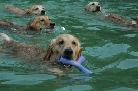夏天真是狗狗玩水的季節,看牠們跳水跳的不亦樂乎,搶玩具,潛水,似乎也不那麼熱了哩!![]()