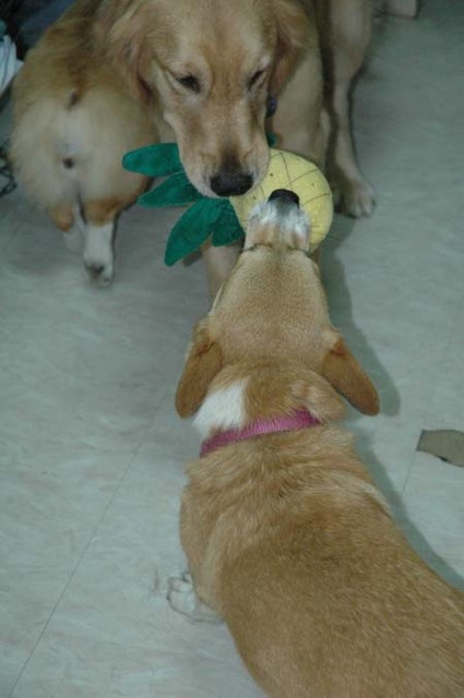 不過也有人小志氣高的Maity硬是要去挑戰Niki,結果一口咬住鳳梨玩具不放的Maity硬生生地被Niki拖到離地。