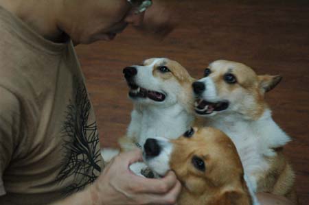 這樣的畫面,每天在我們家都會上演,這可不是家中老爺有怪癖,喜歡聞狗子臭嘴吧,或是喜歡捉弄狗子,搞瑜珈。呵。